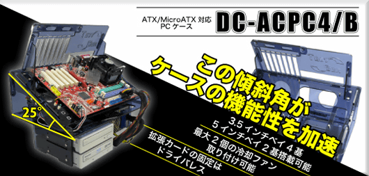 | 「DC-ACPC4/B」はアクリル素材を用いたATX/MicroATX対応PCケースです。マザーボード固定部分に25度の傾斜角を設けることにより視認性を向上させ、PCIe拡張機器等の脱着や構成確認等を容易に行えるようになっています。同時にデザイン性も確保し、インテリアやマザーボード展示の什器としても最適です。 | ||||||||