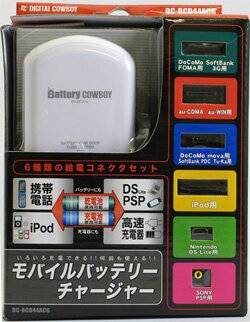 「携帯電話で電話中に電池が切れそう・・・」「ゲームのいいところなのに電池残量が危ない・・・」そんな時に役立つのがモバイルバッテリーチャージャー「DC-BCD44シリーズ」です!携帯電話・iPod・PSP・DS Lite・Network Walkman等の様々な機器に給電できます。 |