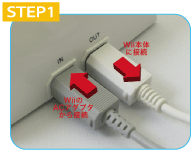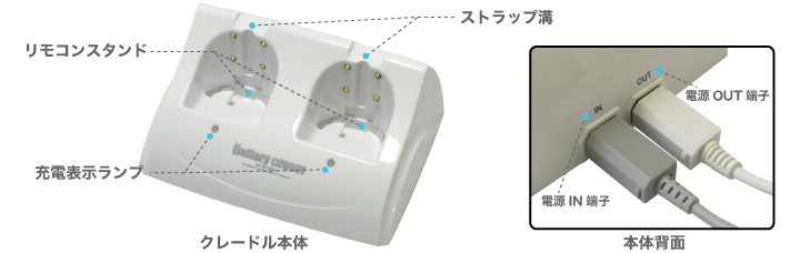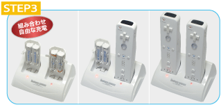 | Wii本体のACアダプタをクレードルに接続して、付属の電源ケーブルをWii本体に接続します。 | 単4型NiNH(ニッケル水素)充電池2本をバッテリーBOXに装着します。 | あとはクレードルにWiiリモコンごと差し込めば充電開始!Wiiの電源がオフでも充電できます。 |