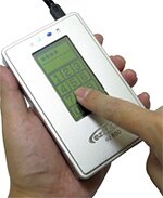 「ez850」は通常のハードディスクケースとは違い単にパソコンに接続しただけではハードディスクとして認識されません。 本体表面には35×68mmのLCDタッチパネルが搭載されており、 暗証番号入力を行わないとデータアクセスが出来ないようになっています。 これにより盗難・紛失などによる第三者へのデータ流出を大幅に低減させることが出来ます。暗証番号は1〜12桁の数字が設定可能です。