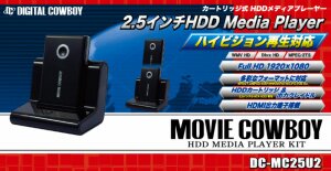 2.5インチハードディスク対応型MOVIE COWBOYシリーズ最新機種の登場です! ハイビジョンコンテンツへの対応とHDMI端子搭載により、従来モデルに比べ映像機能を大幅強化! ハードディスクを搭載させるHDDユニットと映像音声端子を接続するクレイドル部に分離させたユニット構造を採用し、データの持ち運びも手軽に行えます。