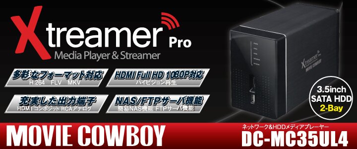 「DC-MC35UL4」は従来モデル DC-MCNP1 の基本的な機能・性能は継承し、超小型ボディながら SATA(I/II)規格 3.5インチ型ハードディスクを2台搭載することが可能なネットワーク&HDDメディアプレーヤーです。本体主要部分には厚さ3.4mmのアルミを使用、しっかりと安定した堅牢なボディです。 |