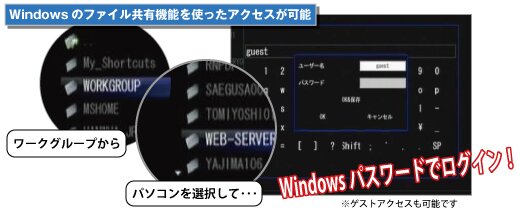 Guestアカウントによるアクセスはもちろん、パスワードを設定した別アカウントによるログインにも対応。Windowsのファイル共有機能を利用した簡易パスワードロックが可能です。