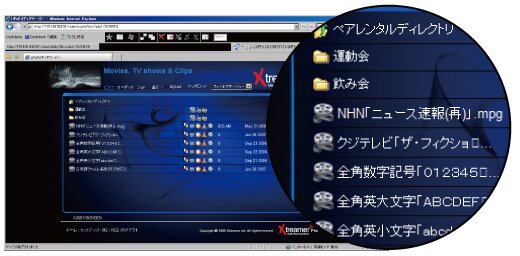 内蔵ハードディスクやUSB-HOSTへ接続したマスストレージ機器へウェブブラウザからアクセスが可能。DDNSサービスと併用することで外出先のパソコンから自由にアップロード&ダウンロードが行えるほか、パソコン上で動画データのストリーム再生が可能。DC-MC35UL4に保存された大容量動画データもダウンロード時間を気にせずにパソコン画面上で楽しむことが可能です。