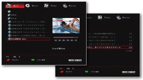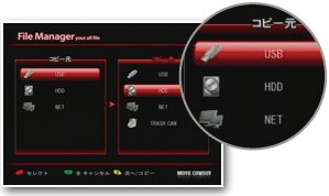 DC-MCNP1本体操作によるコンテンツのコピー等のファイル管理が可能です。USB-HOSTに接続したデジタルカメラの画像をコピーしたり、視聴を終えた動画ファイルの削除なども画面上で簡単に行えます。