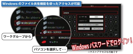 Guestアカウントによるアクセスはもちろん、パスワードを設定した別アカウントによるログインにも対応。Windowsのファイル共有機能を利用した簡易パスワードロックが可能です。