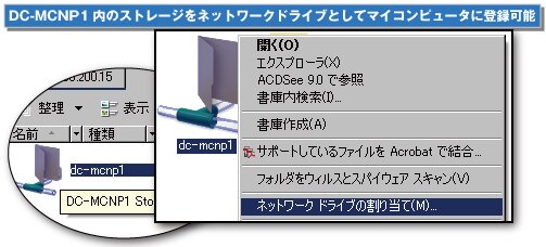 パソコンからDC-MCNP1へデータアクセスを容易にするNAS機能を搭載。内蔵させたハードディスクやUSB-HOSTに接続したマスストレージ機器をWindowsのネットワークドライブへ割り当てることが出来るので、DC-MCNP1にコンテンツを移動させるためにパソコンのある場所へ本体を持ち運ぶ必要はありません。