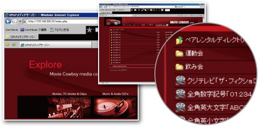 内蔵ハードディスクやUSB-HOSTへ接続したマスストレージ機器へウェブブラウザからアクセスが可能。DDNSサービスと併用することで外出先のパソコンから自由にアップロード&ダウンロードが行えるほか、パソコン上で動画データのストリーム再生が可能。DC-MCNP1に保存された大容量動画データもダウンロード時間を気にせずにパソコン画面上で楽しむことが可能です。