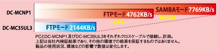 ネットワーク転送速度が大幅スピードアップ!SAMBAモードでは56〜64Mbps、FTP転送時も当社DC-MC35UL3との比較において2倍以上の速度向上を実現しています。