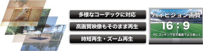 AVCHDビデオカメラ等で採用されているH.264(m2ts)形式のハードウェア再生に対応。ハイビジョンカメラで撮影したH.264やMPEG2-TS形式の高画質な映像がそのままお楽しみいただけます。