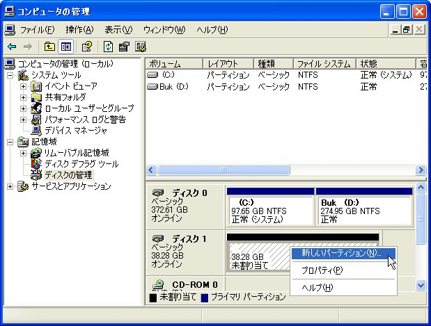 5. 「未割り当て」の部分を右クリックし表示されるメニューから「新しいパーティション(N)」を選択します。
